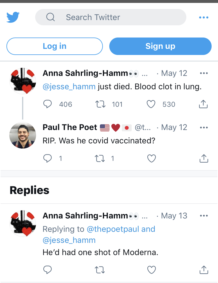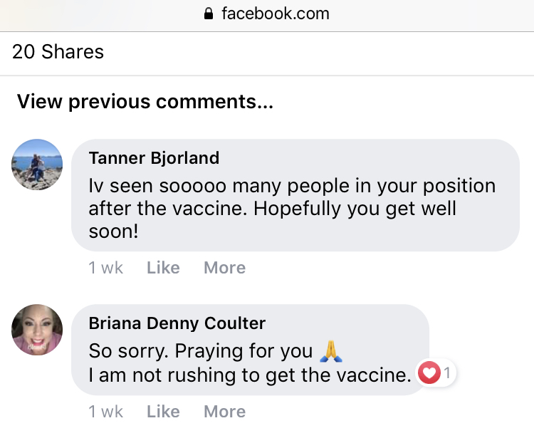 Steve Koek from Chicago, Illinois got his vaccine sometime before April 24, 2021 judging by his Facebook photo. He had a heart attack not long after according to the gofundme page, and ended up in ICU where he remained unresponsive for several days.