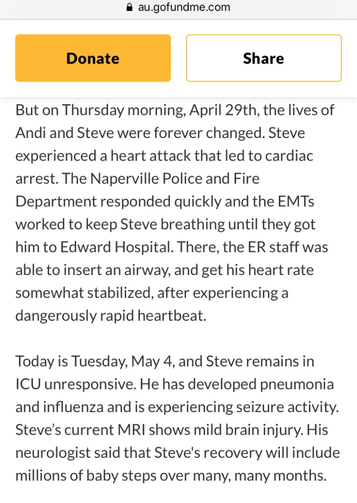 “On Thursday morning, April 29th, the lives of Andi and Steve were forever changed. Steve experienced a heart attack that led to cardiac arrest. The Naperville Police and Fire Department responded quickly and the EMTs worked to keep Steve breathing until they got him to Edward Hospital. There, the ER staff was able to insert an airway, and get his heart rate somewhat stabilized, after experiencing a dangerously rapid heartbeat.