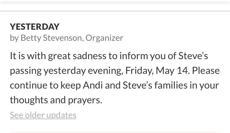 Steve seems to have been very likable and loved. His fundraiser generated over $29,000.00 of the $35,000.00 goal.