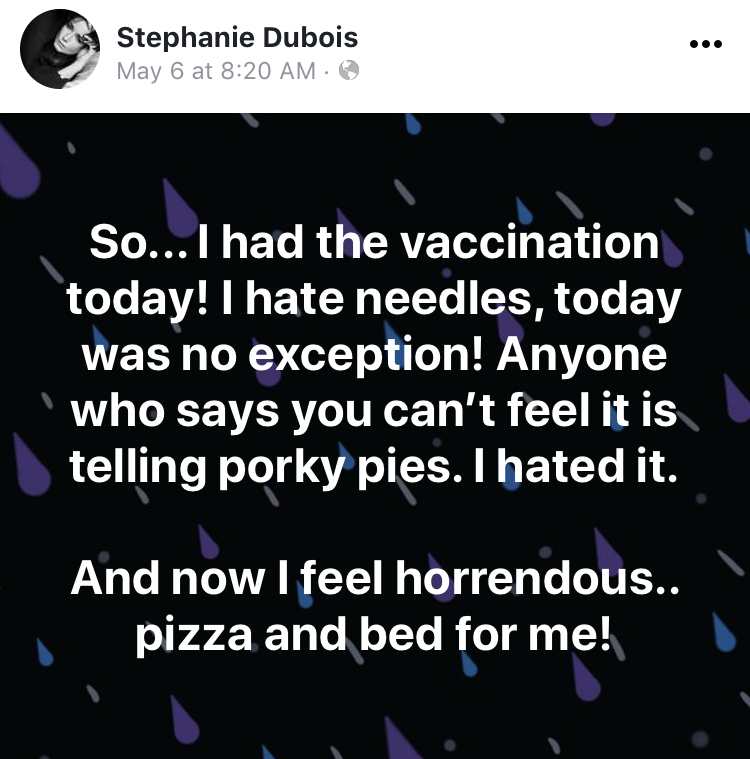 Stephanie had made a Facebook post on May 6, 2021 that she had gotten her vaccine and felt “horrendous”.