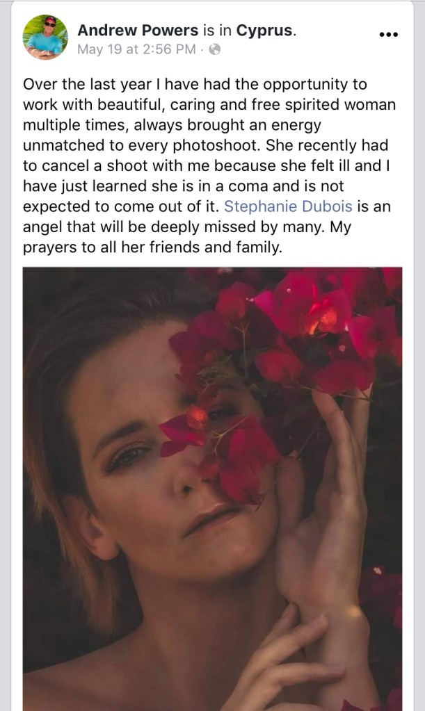 Stephanie Dubois, of Cyprus, was a model with RMG Model Agency. She was recently hospitalized and in a coma after a brain hemorrhage. Her condition was said to be a reaction from the Covid Astra Zeneca vaccine according to friends and family on social media.