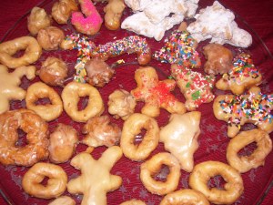 If you do not have a doughnut cutter, all cutters will work. We used Christmas cookie cutters and rolled small balls for doughnut holes. We also used a cup and just punch out the center with our finger, and did it the old fashioned way.